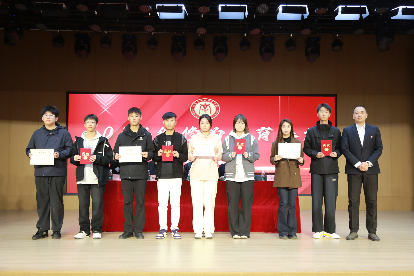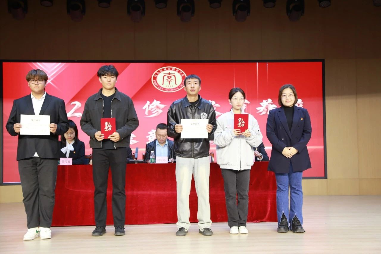 学生处处长、团委书记、全媒体学院主任刘子威为汽车工程系四十三营、民航系二十三营、医学技术系二十六营、护理系十八营颁发2024级新生修为教育养成“优秀营队”奖;