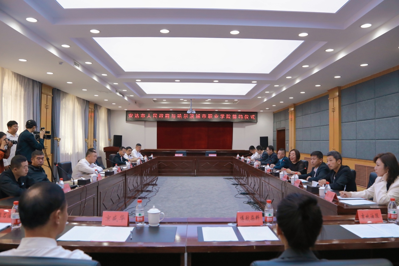 签约仪式上,蒋敏军代表安达市人民政府对哈尔滨城市职业学院代表团的到来表示热烈欢迎,段有志对安达市人民政府的热情接待表示衷心感谢。随后,双方本着“资源共享、优势互补、互利共赢、共同发展”的原则,聚焦校地协同发展,围绕合作方向开展深入交流,确定影视基地产业项目、就业创业孵化平台、人才培养、科研与技术合作、企业员工培训与继续教育、信息与资源共享等合作内容。