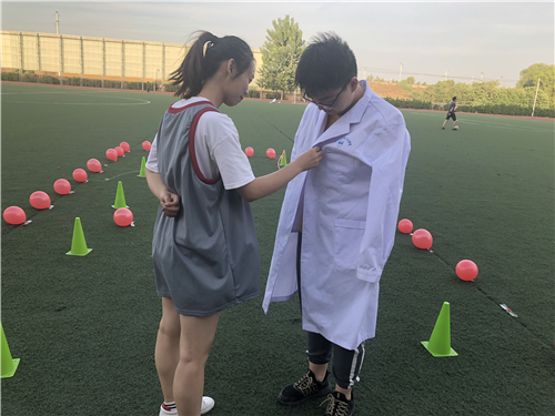 “体”主题的“抗菌健体”环节,同学们分别扮演医生与病菌,开展丢沙包游戏,让参与者形象地感受到治病救人时消灭病毒细菌的过程,让同学们明白守护、拯救的意义,神圣的使命感与责任感是持续坚守医德行为的保障。
