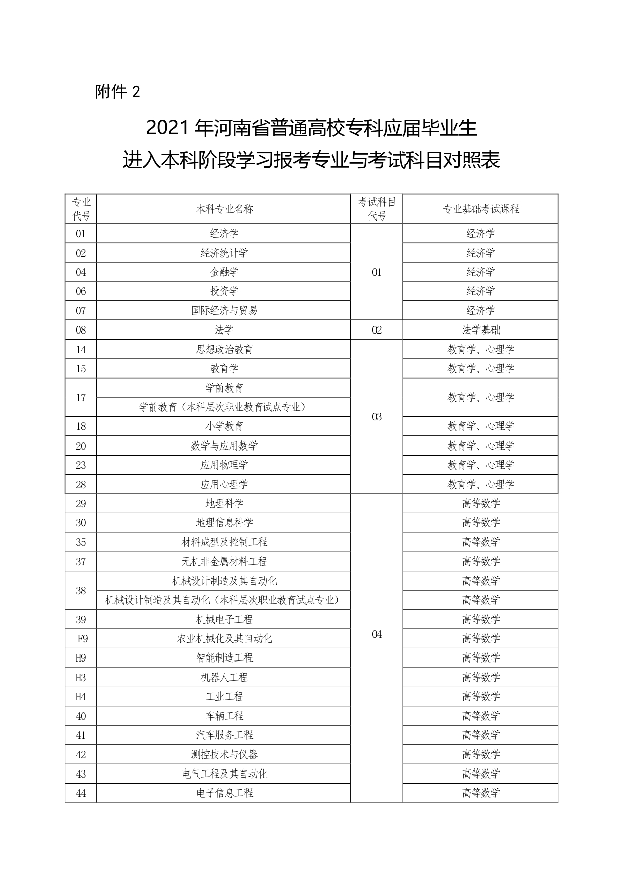 2021年河南省普通高校专科应届毕业生进入本科阶段学习本、专科专业对照及考试课程一览表