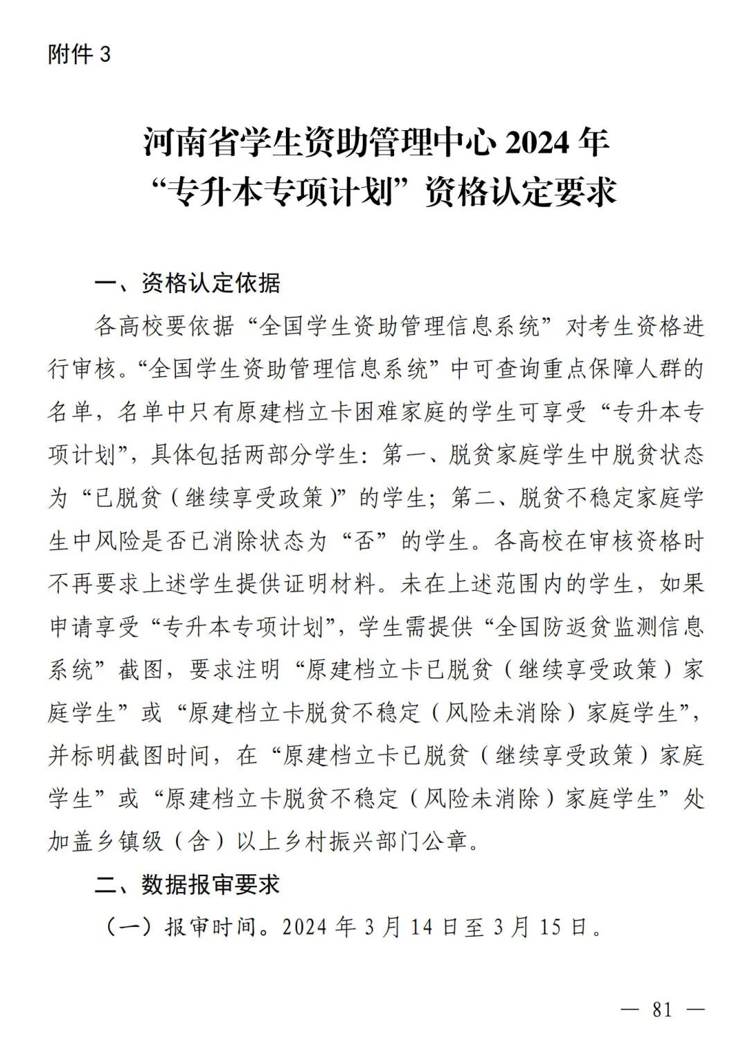 3.河南省学生资助管理中心2024年“专升本专项计划”资格认定要求