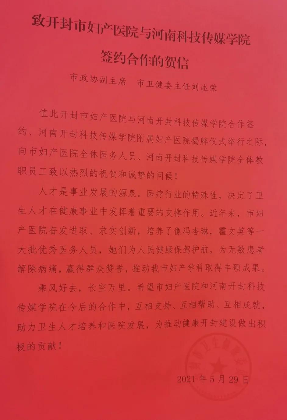 2021年5月29日上午9点30分,河南开封科技传媒学院与开封市妇产医院合作签约暨河南开封科技传媒学院附属妇产医院揭牌仪式在开封市妇产医院鼓楼院区门诊楼前正式举行。