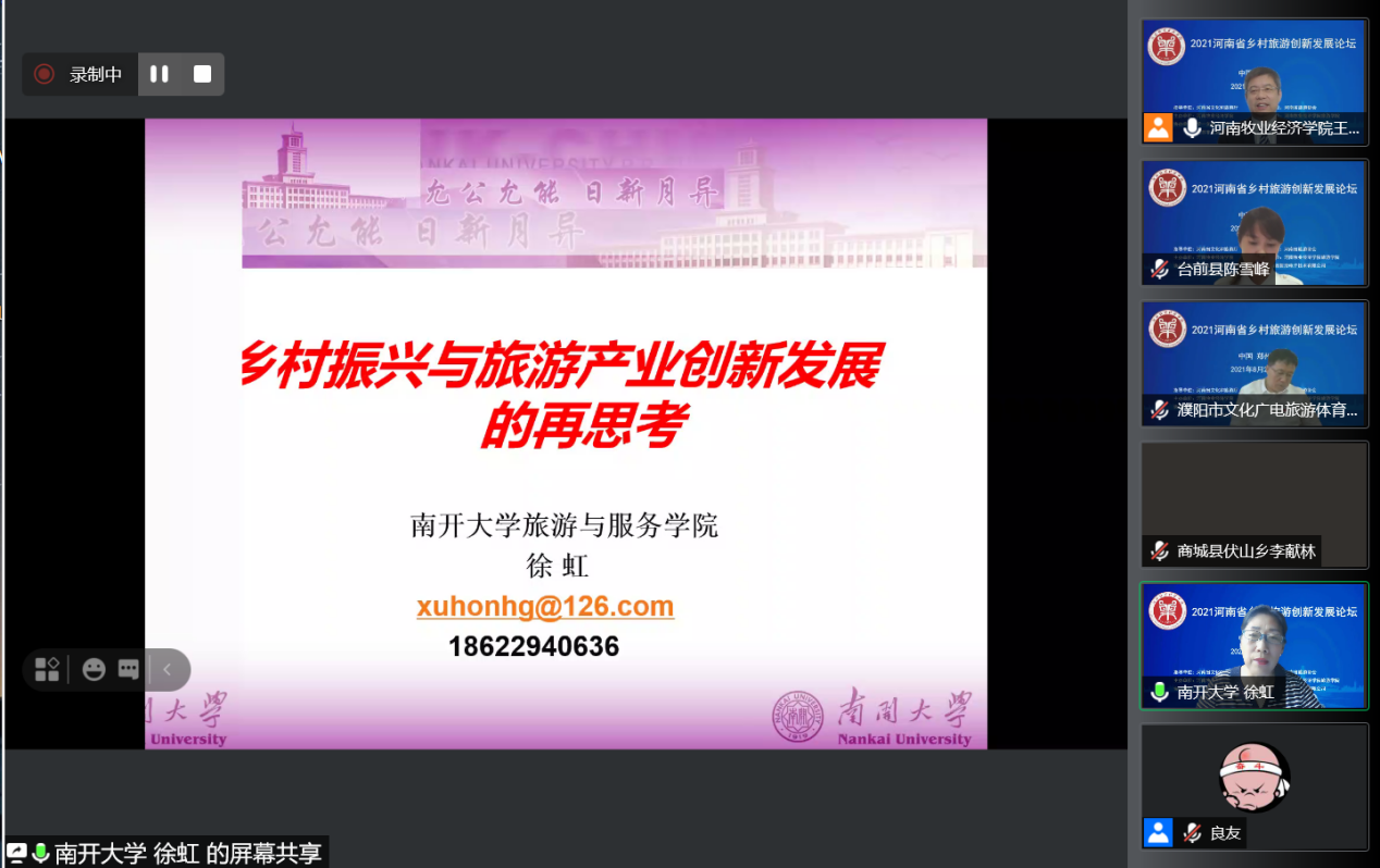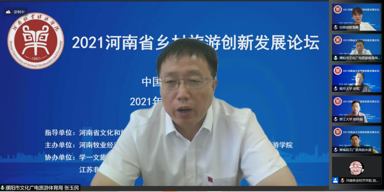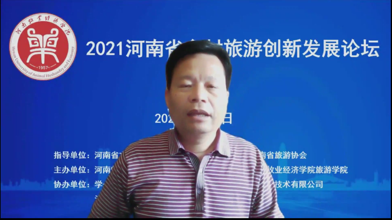 8月2日上午,由河南省文化和旅游厅指导,河南省旅游协会支持,河南牧业经济学院主办的“2021河南省乡村旅游创新发展论坛”以腾讯会议线上直播方式成功举办。河南牧业经济学院副校长吴中教授出席论坛,河南省文化和旅游厅、河南省旅游协会、河南省会展业商会、郑州市文化广电和旅游局、濮阳市文化广电旅游体育局、商城县文化广电和旅游局、南开大学、浙江大学、郑州大学、河南大学、河南财经政法大学等省内外60余家单位和高校的近300位领导、行业专家、企业高管、高校教师和乡村旅游基层管理者参加。论坛由河南牧业经济学院旅游学院院长王德静教授主持。