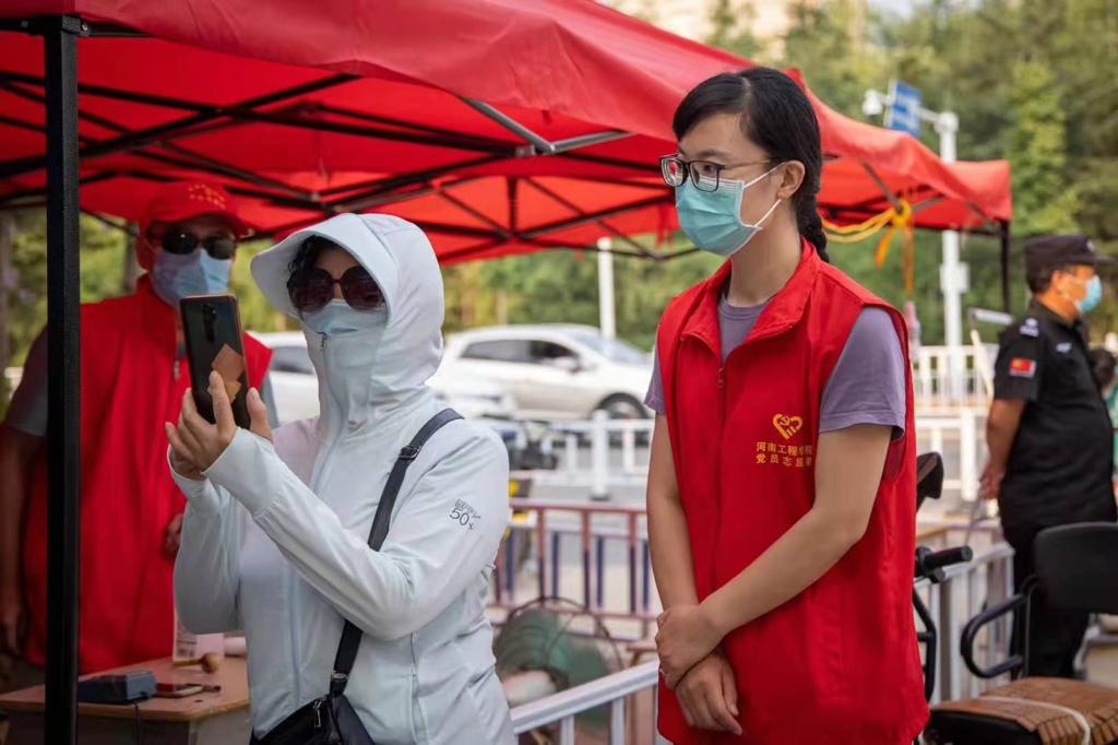 在鸿鹄花园,郭丹与志愿队的同志做好值班值守,劝停、扫码、核验、放行。用温柔的话语、坚定的态度切实保证学校疫情防控措施落地落实,为筑牢鸿鹄花园防线站好第一班岗。