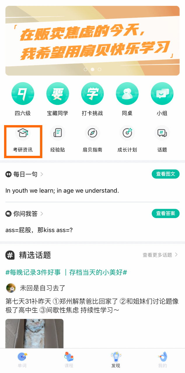 方式六:在扇贝英语APP中找到“发现”栏目,点击【考研资讯】-【招生直播】,进入中原工学院直播间。