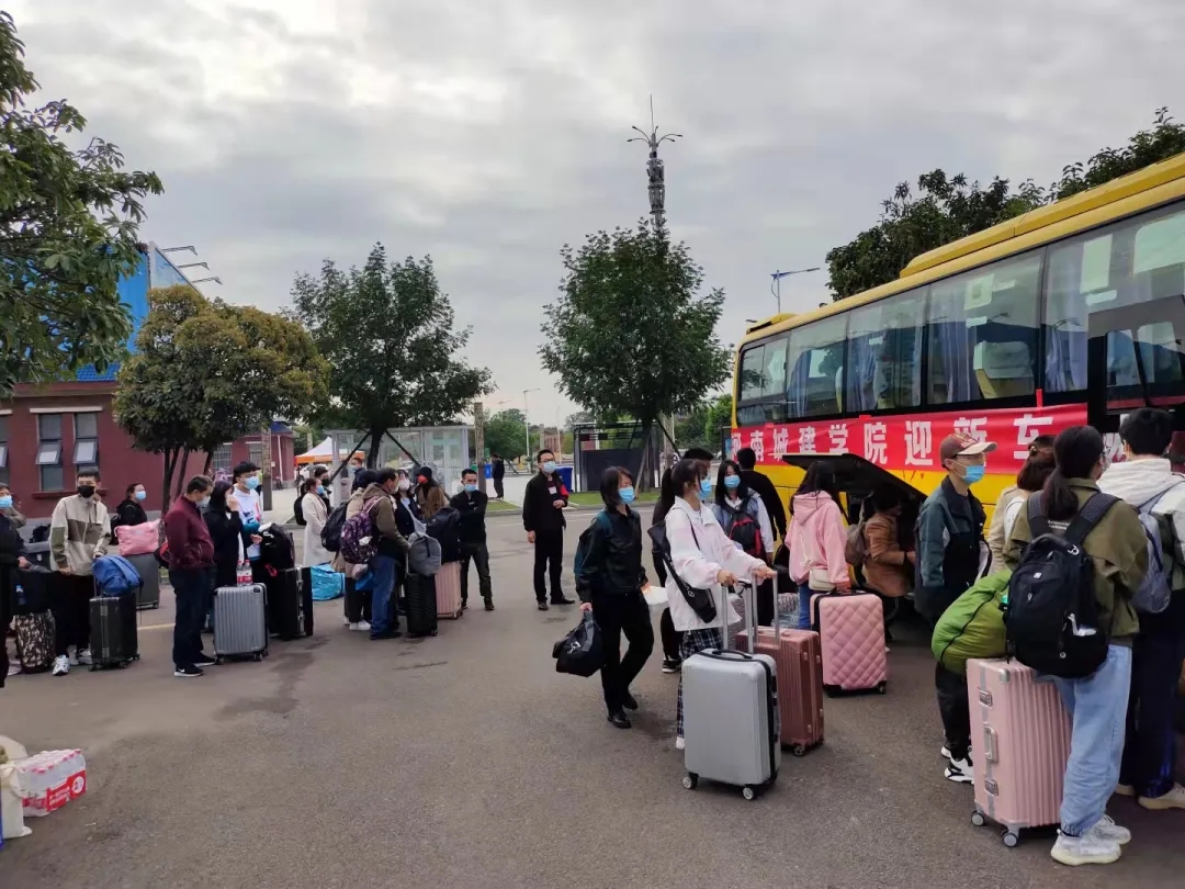 清晨七时许,第一辆载满新生的大巴车抵达学校大门口,下车后,经过测量体温、行李消杀、提交健康码、行程码、人脸识别等程序进入校园后,热烈的迎新气氛扑面而来:由教职工志愿者组成的爱心车队整齐有序、一字排开等待接送新生同学,彩虹门上写着热情洋溢的欢迎词,高高举起的指示牌向新同学展示着学长学姐的关爱,活泼可爱的小城宝化解了新生初入校园的拘谨与陌生。