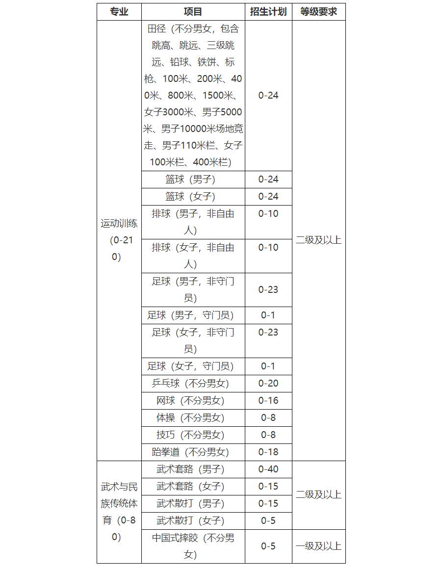 注:以上计划为预定计划(含优秀运动员免试入学招生计划),正式计划以教育部、国家体育总局下达为准。