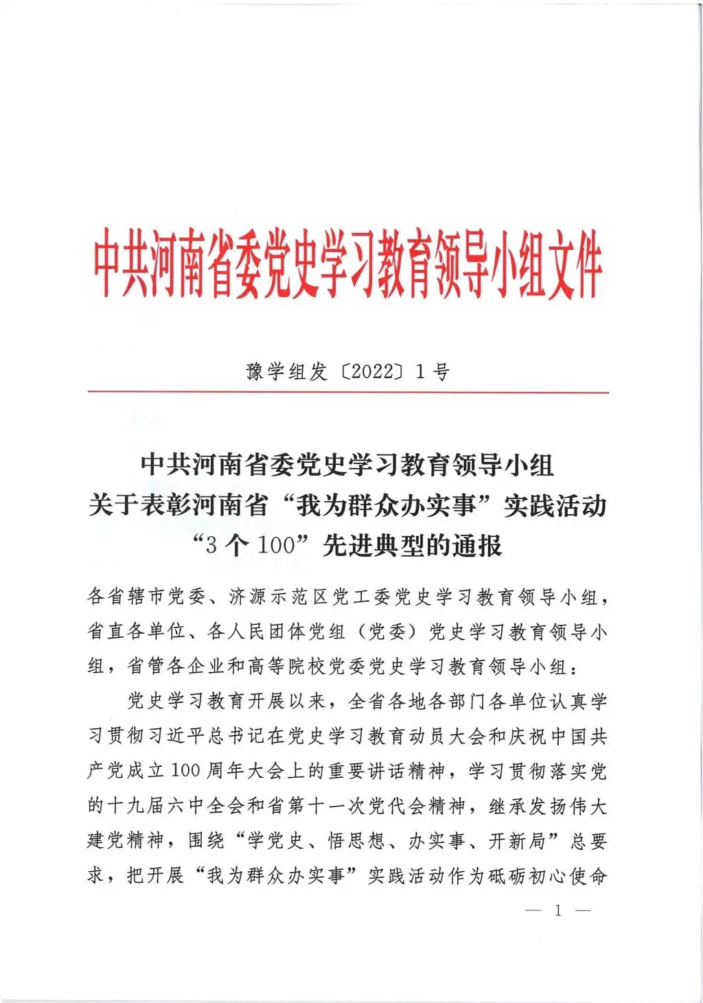学校在河南省“我为群众办实事”实践活动“3个100”评选中荣获两项佳绩