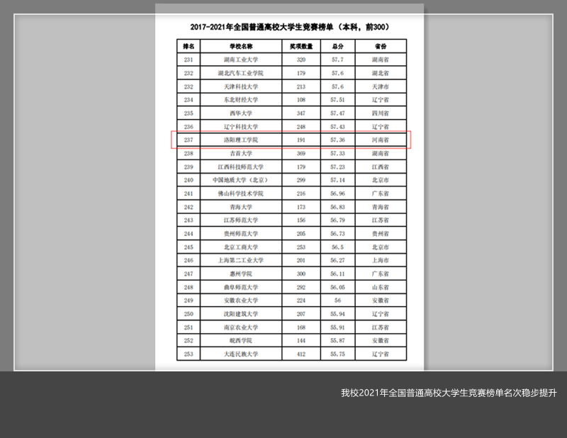 近日,中国高等教育学会高校竞赛评估与管理体系研究工作组发布《2021全国普通高校大学生竞赛分析报告》。洛阳理工学院在2021年各项榜单中的获奖数和排位名次较2020年均稳步提升。