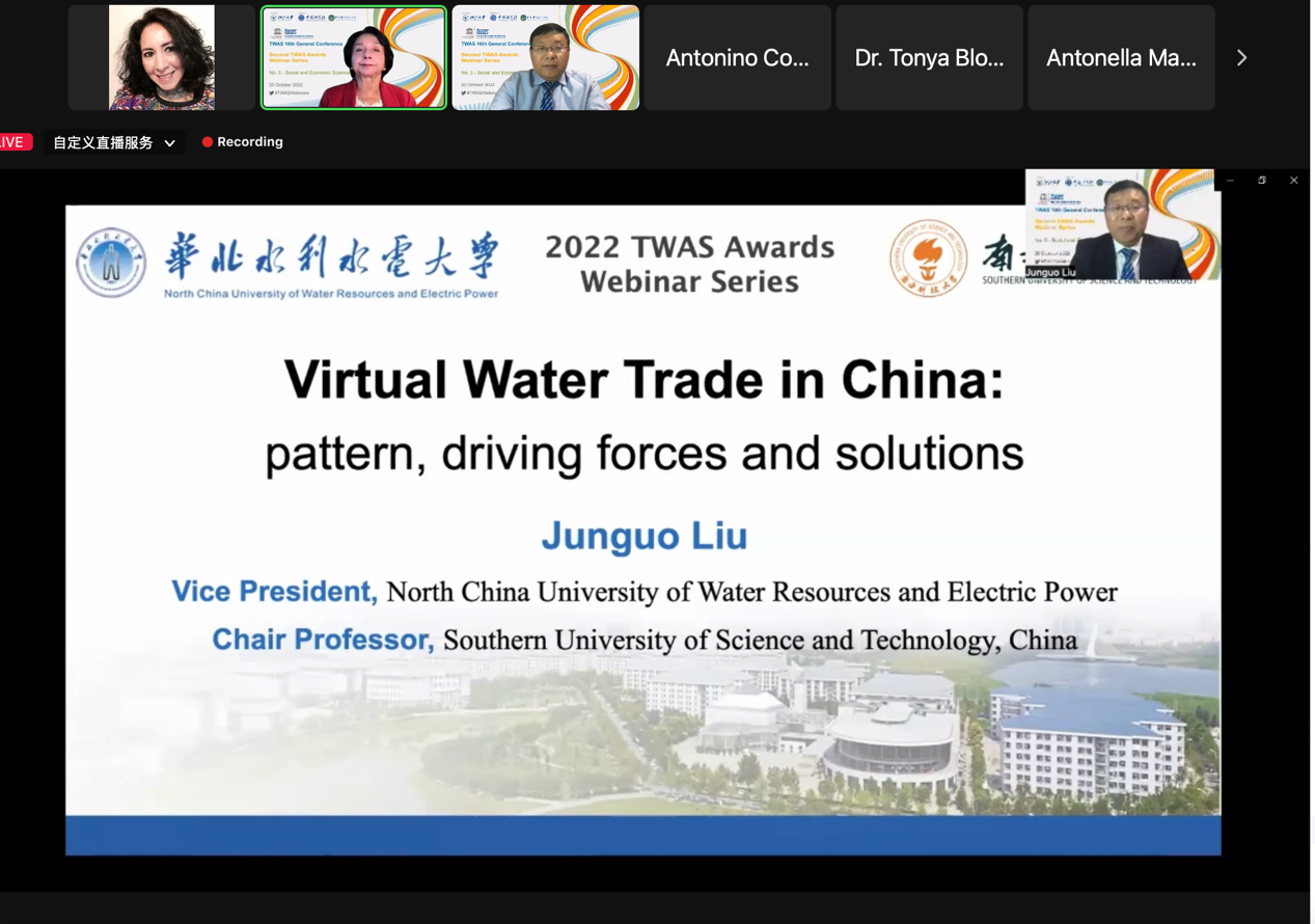 10月20日,刘俊国教授应邀参加世界科学院奖网络研讨会系列(第5场研讨会:社会和经济科学),并以“中国虚拟水贸易:模式、驱动力与解决方案”为题作获奖者主旨报告。本次网络研讨会由世界著名教育学家,入选加拿大皇家学会院士、欧洲科学院终身院士、世界科学院院士加拿大蒙特利尔麦吉尔大学教授拉特娜·戈什(Ratna Ghosh)主持。