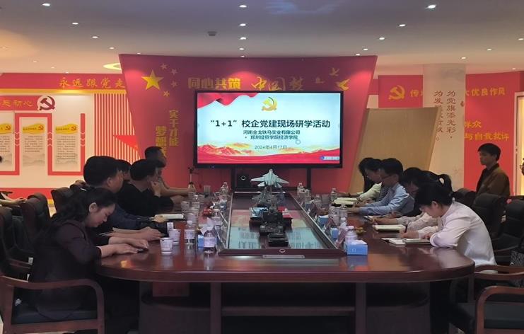 为进一步发挥党建引领作用,促进校企合作育人,4月17日下午,郑州经贸学院经济学院赴河南金马集团开展“1+1”校企党建现场研学活动。郑州市钢铁贸易商会会长、金马集团董事长黄涛,郑州市钢铁贸易商会常务副会长兼钢管分会会长、河南大道至简钢铁有限公司总经理任向军,中共河南金马工贸有限公司支部书记、河南飞马钢铁销售有限公司总经理郭海亮,郑州经贸学院经济学院院长牛艳莉,副院长李伟,党委副书记、副院长赵亚齐,经济学院党支部书记代表、教师党员代表和学生党员代表等30余人参加了此次活动。