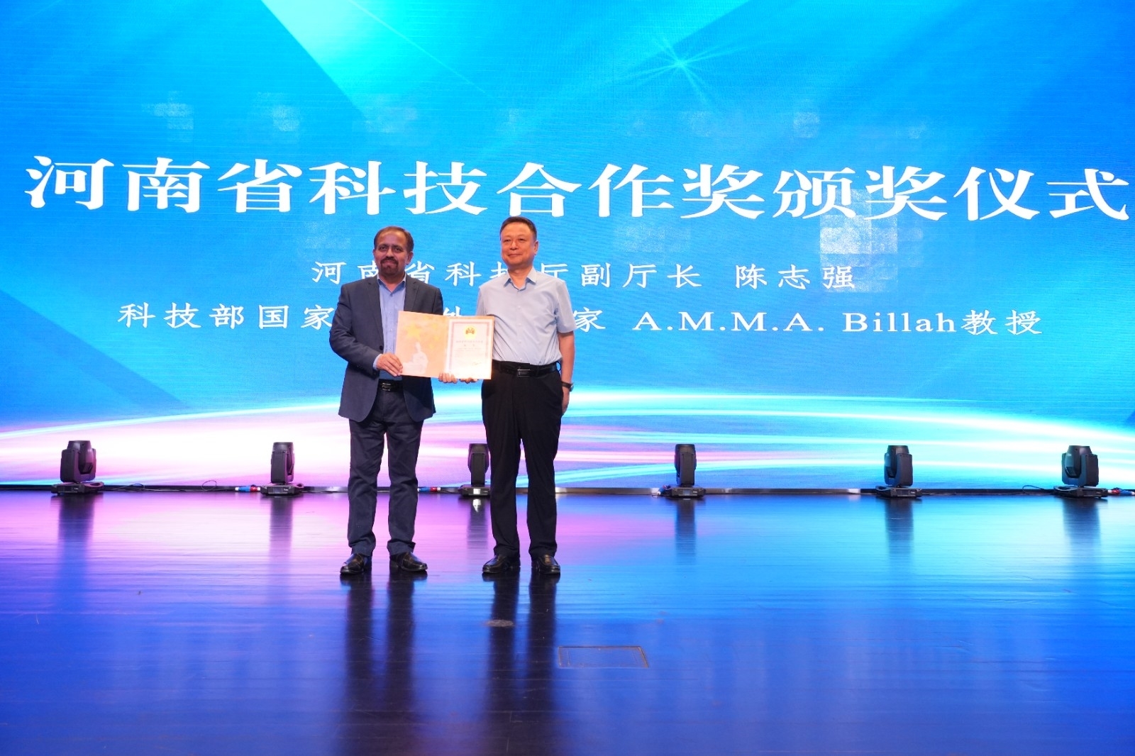 河南省科技厅副厅长陈志强为郑州师范学院颁发河南省人民政府科学技术合作奖证书