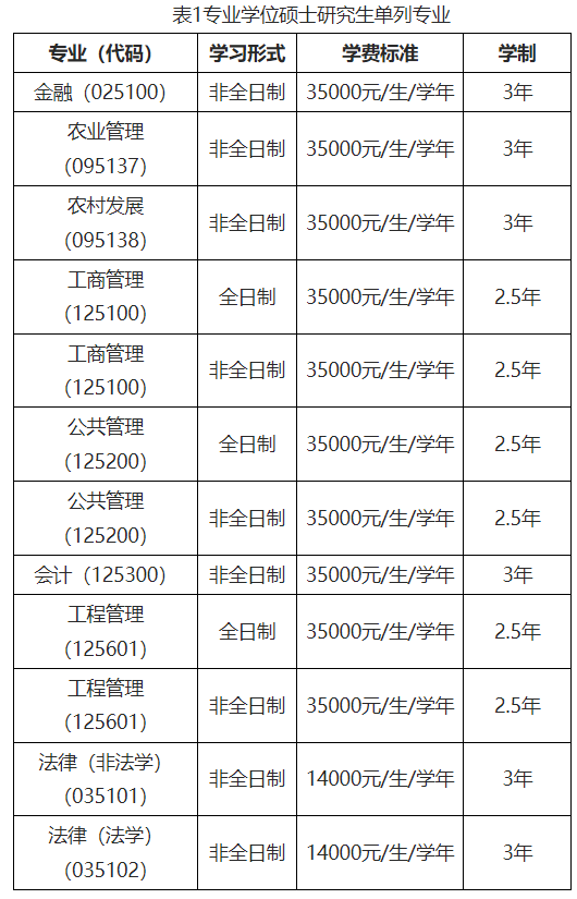 2.专业学位硕士研究生,除单列专业外,学费标准为8000元/生/学年。单列专业名单详见表1。