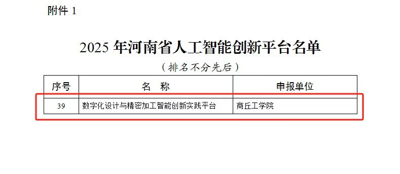 为贯彻落实《河南省新一代人工智能产业链培育行动方案(2023—2025年)》(豫政办〔2023〕63号)等文件有关要求,经商丘市工业和信息化局推荐,河南省工业和信息化厅组织专家评审,商丘工学院“数字化设计与精密加工智能创新实践平台”创新平台和“前沿大模型深度赋能教育创新:构建全景式AI智能教育生态新范式”创新应用入选河南省人工智能创新平台和创新应用名单。