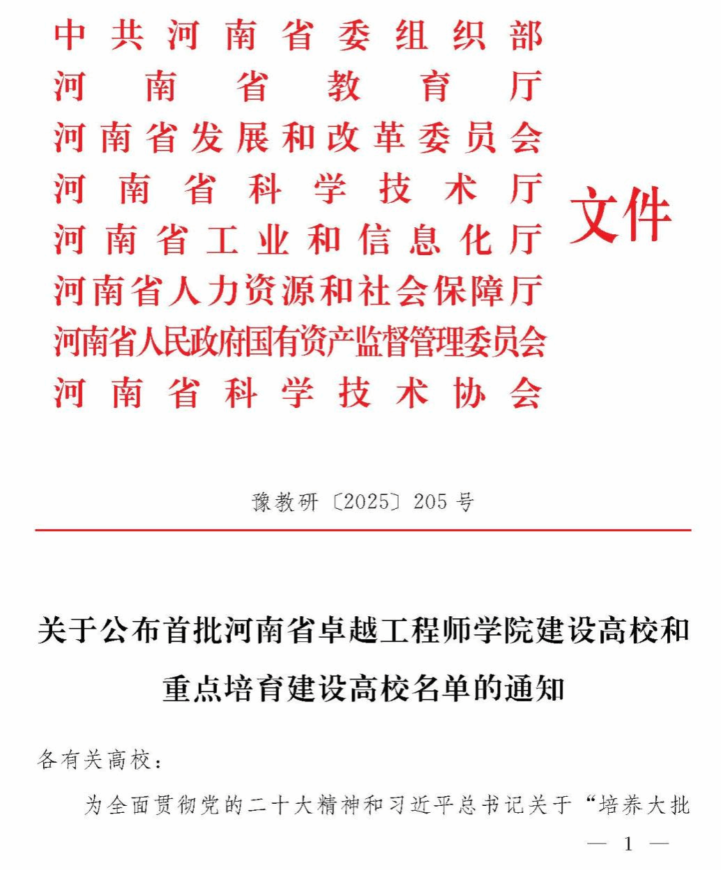 近日,中共河南省委组织部、河南省教育厅等8部门联合发布《关于公布首批河南省卓越工程师学院建设高校和重点培育建设高校名单的通知》(豫教研〔2025〕205号),河南科技大学被确定为首批河南省卓越工程师学院建设高校。