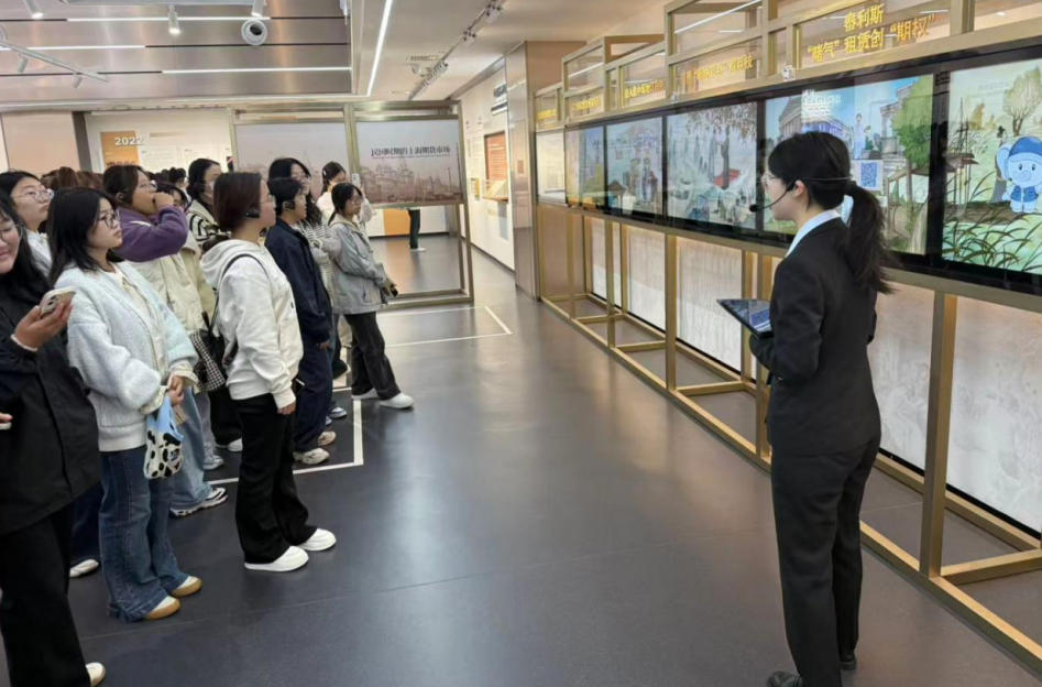 在专业讲解员的带领下,师生一行走进郑商所期货与衍生品博览馆,开启沉浸式学习之旅。馆内珍贵的历史文件陈列区,从早期期货交易章程到历年市场监管政策文本,清晰勾勒出中国期货市场从探索起步到规范发展的完整脉络;互动交易模拟区的虚拟交易台前,新生们亲手操作下单流程,在实时行情波动中直观感受杠杆效应下的收益与风险变化,深刻理解衍生品工具的特性;而危机情景重现展区通过动态影像,还原了历史上典型的期货市场风险事件,让学生们对“风险管理”的重要性有了更具象的认知。整个参观过程围绕期货市场两大核心功能展开:在“价格发现”功能展示区,讲解员结合农产品、工业品等期货品种的价格走势图,解析期货市场如何通过集中交易反映供需变化;“风险对冲”功能板块则以企业案例为切入点,说明实体企业如何利用期货工具规避原材料价格波动风险。