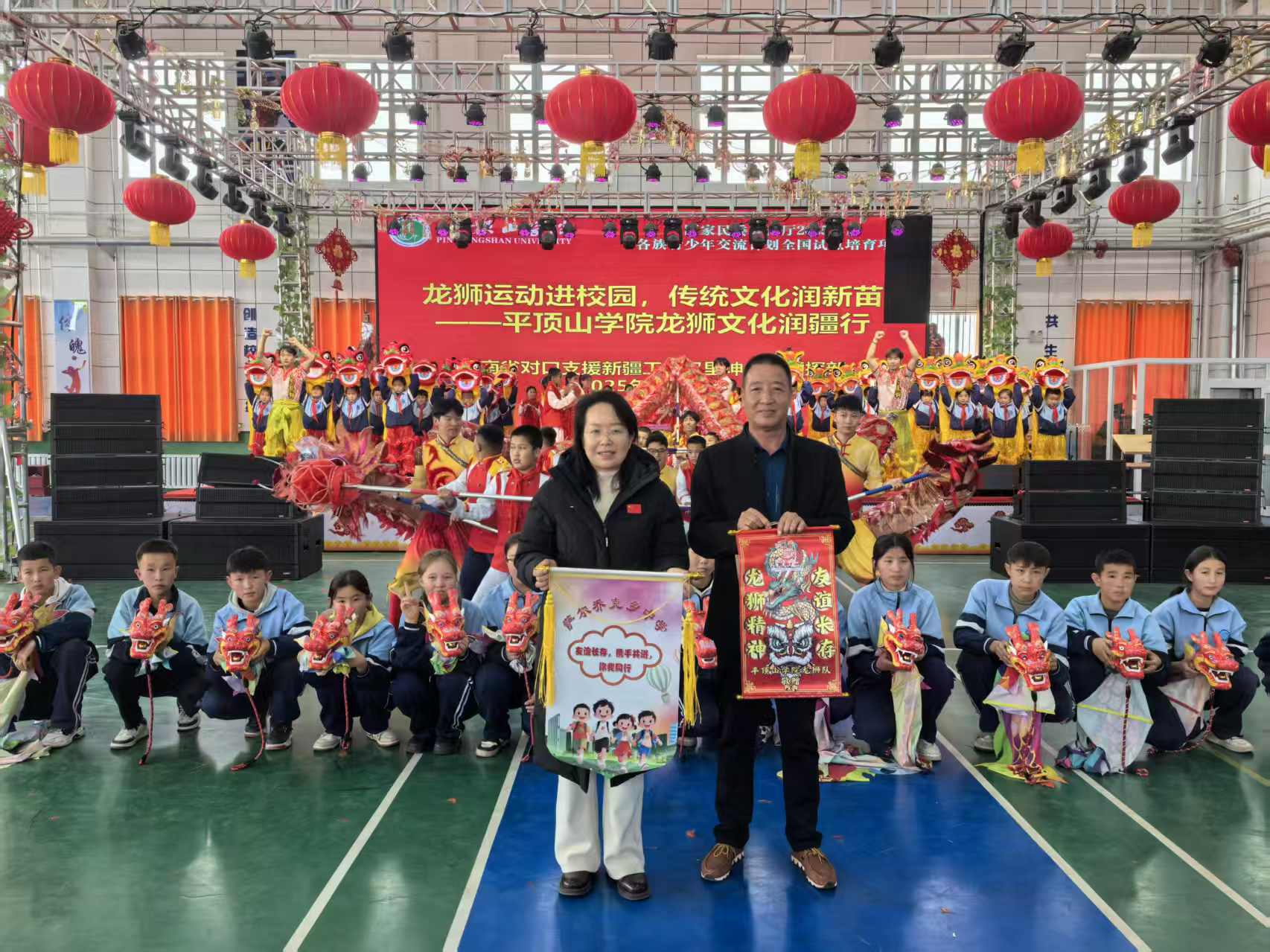 活动期间,项目团队与巴里坤县教育局及各学校负责人围绕“龙狮文化进校园”主题进行了深入交流座谈。平顶山学院体育学院党委书记井怡琼代表团队,向各学校赠送了象征龙狮精神传承的旗帜与教具,校方则回赠校旗、锦旗及传统书法作品等,豫巴两地跨越千里的情谊在仪式中进一步凝聚。