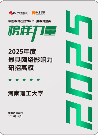 近日,中国教育在线“榜样力量·2025年度教育盛典”优秀案例名单公布。河南理工大学凭借极具创新性与前瞻性的招生宣传策略,以及扎实的宣传执行实力,从众多高校中突围,获评“2025年度最具网络影响力研招高校”。