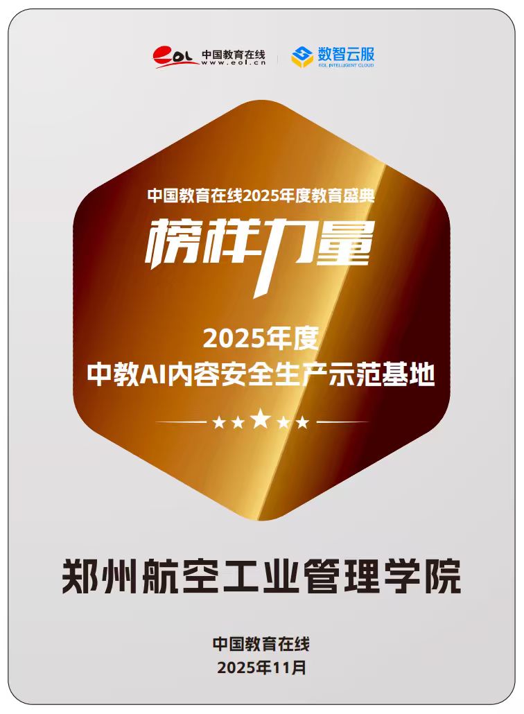 近日,中国教育在线“榜样力量·2025年度教育盛典”优秀案例名单公布。郑州航空工业管理学院凭借在新媒体领域的深远影响力和对AI技术的高水平运用及卓越成果,荣获“2025年度中教AI内容安全生产示范基地”。