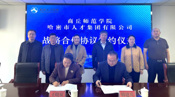 在哈密市与人力资源和社会保障局和人才集团进行了工作对接。并与局长蒋怀诚,河南援疆干部副局长高波,援疆干部兵团第十三师火箭农场党委常委、副场长杨飞,人才集团董事长韩建兵、总经理王瑶进行了座谈。王晓征向领导介绍了学校的发展概况、学科专业特色以及服务社会、支持边疆建设的意愿。双方重点围绕依托学科优势和继续教育资源,面向哈密乃至新疆地区开展干部培训、师资进修、职业技能提升等各类培训项目合作的可能性进行了深入交流和探讨,旨在将学校的教育资源优势与新疆的发展需求紧密结合,为援疆工作贡献教育力量。为进一步建立长效合作机制,深化两地人才合作交流,商丘师范学院与哈密市人才集团签署了人才交流合作协议,协议约定,双方将在人才信息共享、毕业生就业推荐、人才联合培养、实习基地建设、举办招聘活动等方面开展全方位、多层次的合作,共同搭建高效、畅通的人才交流互动平台,促进人才资源优化配置,推动各项合作意向落地生根、开花结果。随后,王晓征与哈密人才集团董事长韩建兵共同为“人才交流工作站”“大学生就业实习基地”举行了揭牌仪式。