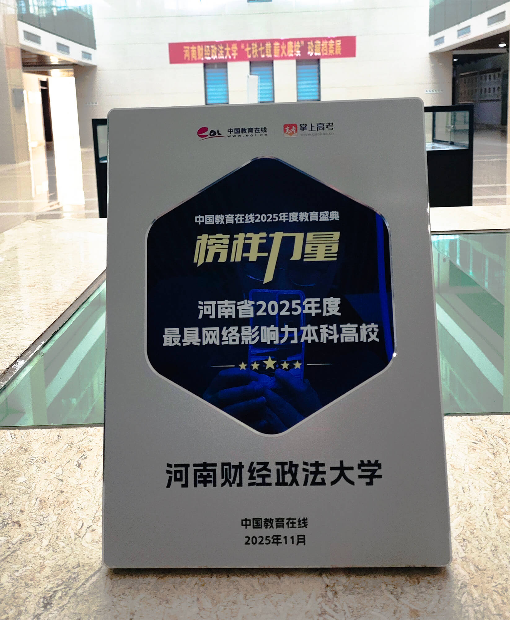 近日,中国教育在线“榜样力量·2025年度教育盛典”优秀案例名单公布。河南财经政法大学凭借极具创新性与前瞻性的招生宣传策略,以及扎实过硬的宣传执行实力,从众多高校中突围,获评“河南省2025年度最具网络影响力本科高校”。