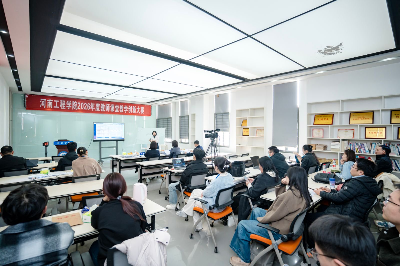 11月29日,以“创新引领课堂,智慧塑造未来”为主题的河南工程学院2026年度教师课堂教学创新大赛现场决赛,在河南工程学院龙湖南校区8号楼举行。经过资格初审、线上评审等多轮严格遴选,从全校23个学院42位报名教师中脱颖而出的35位教学能手同台竞技,共展教学智慧与创新风采。本次大赛由超星公司提供现场直播支持,线上线下同步呈现。
