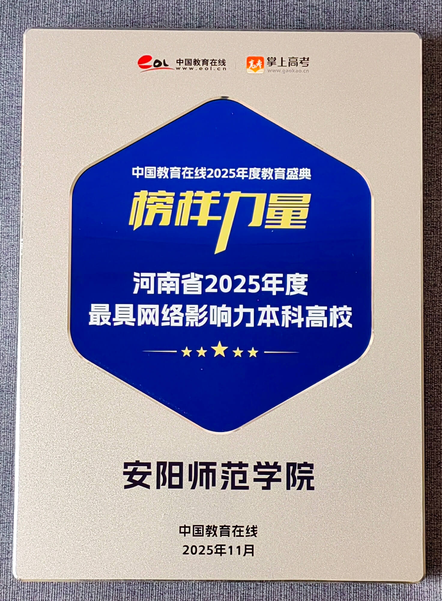 近日,中国教育在线“榜样力量·2025年度教育盛典”优秀案例名单公布。安阳师范学院凭借极具创新性与前瞻性的招生宣传策略,以及扎实过硬的宣传执行实力,从众多高校中突围,获评“河南省2025年度最具网络影响力本科高校”。