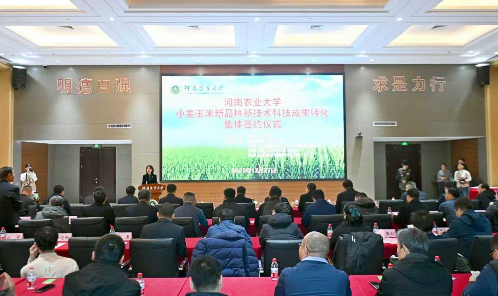 12月27日,河南农业大学在郑州举行小麦玉米新品种新技术科研成果转化集体签约仪式,现场签约金额达3863万元。据悉,加上前期已完成的作物新品种转让,河南农业大学农学院全年成果转化总金额累计7220万元,有力彰显了学校在农业科技创新与成果转化方面的强劲实力。