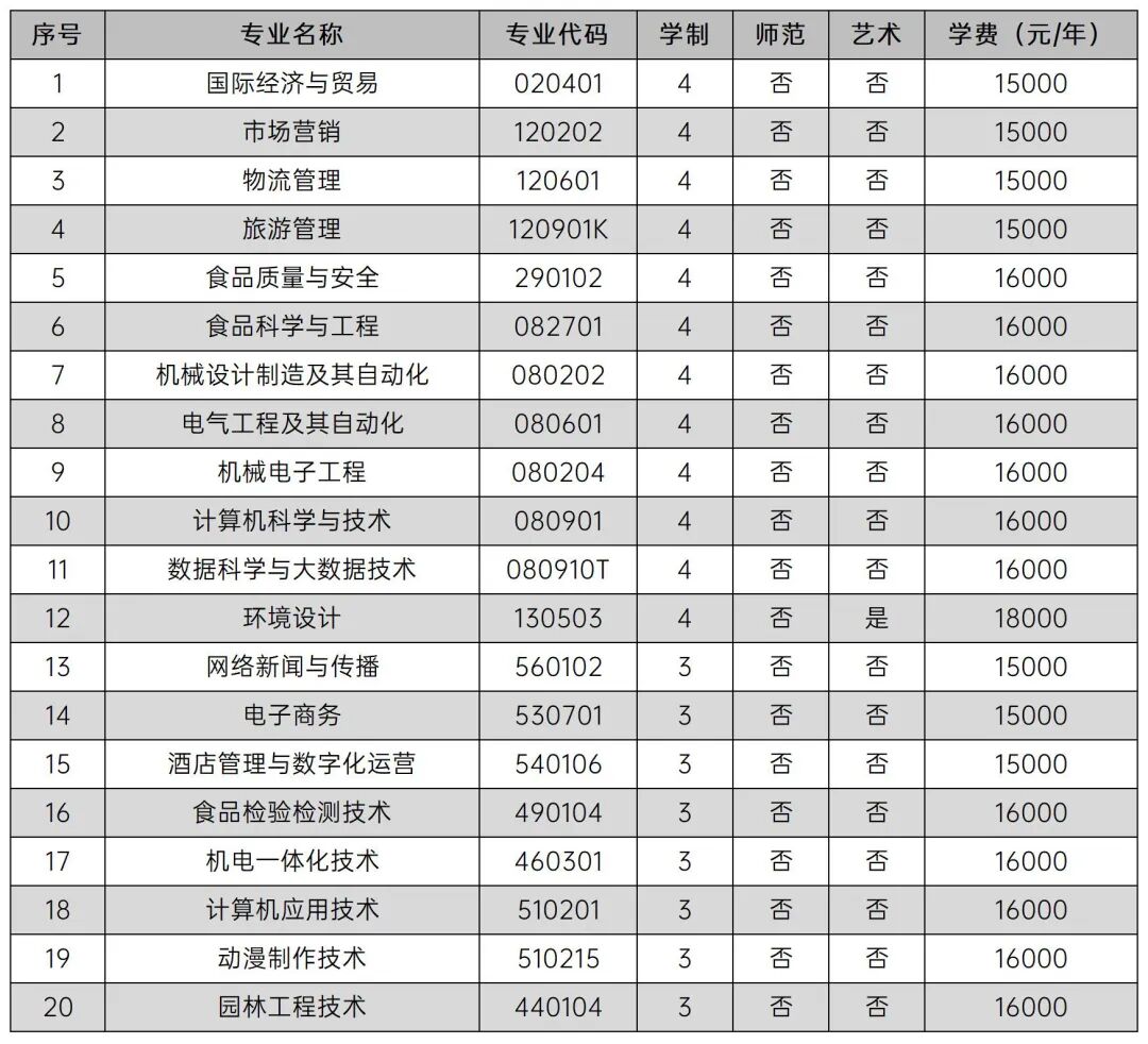 第十九条 学校严格执行河南省发展和改革委员会、河南省教育厅审批备案的收费标准。对口本科学费:国际经济与贸易、市场营销、物流管理、旅游管理专业15000元/生· 年,食品质量与安全、食品科学与工程、电气工程及其自动化、机械设计制造及其自动化、机械电子工程、计算机科学与技术、数据科学与大数据技术专业16000元/生·年,环境设计专业18000元/生·年;对口专科学费:网络新闻与传播、电子商务、酒店管理与数字化运营专业15000元/生·年,计算机应用技术、动漫制作技术、食品检验检测技术、园林工程技术、机电一体化技术专业16000元/生·年,住宿费:1500元/生·年(六人间)。