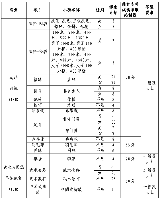 运动训练专业招收田径、篮球、排球(非自由人)、足球(十一人制)、乒乓球、羽毛球、网球、体操、技巧、跆拳道、攀岩11个项目。