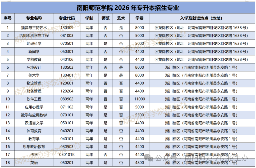 南阳师范学院2026年专升本招生专业