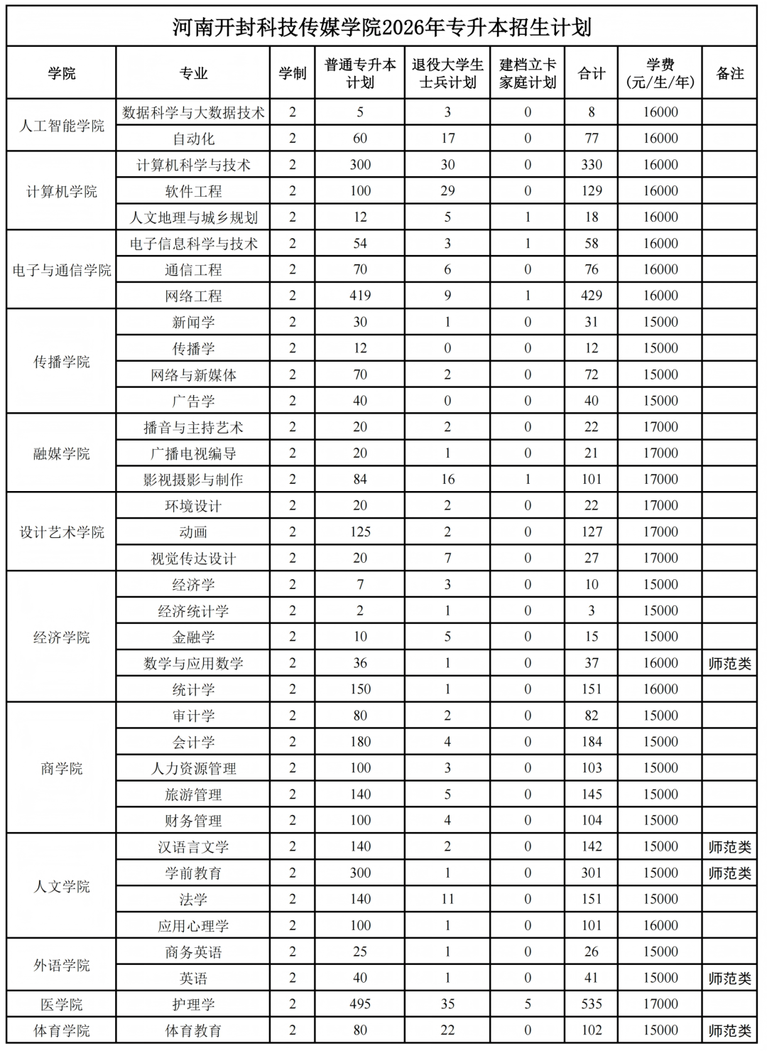河南开封科技传媒学院2026年专升本招生计划公布如下: