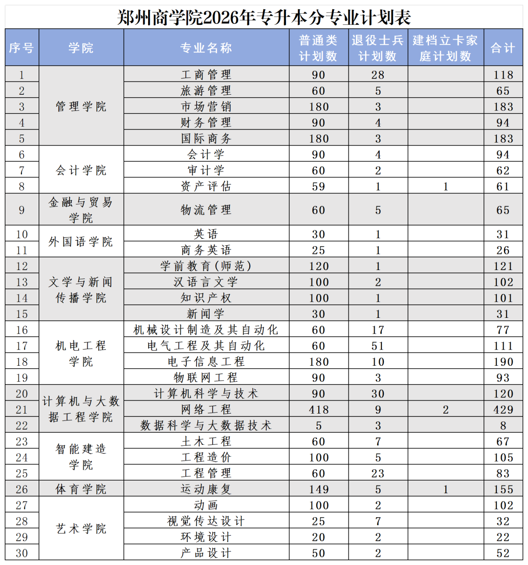 2026年专升本各专业招生计划如下