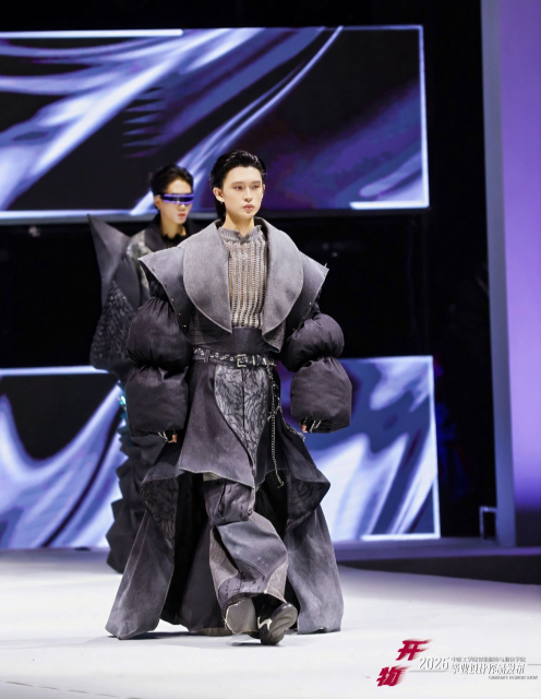 本次展演上半场以运动装、职业装为主题,饱含新锐设计师的创新精神和时尚创意:“千折·归一”系列运动装把折纸的几何美感与立体逻辑深度融合,通过复杂的面料改造工艺,将设计焦点引向服装的结构美学与运动叙事;“空境攀行”系列运动装将光导纤维、心率感应模块与服装结构相融合,形成兼具实用性与创新性的成衣作品。