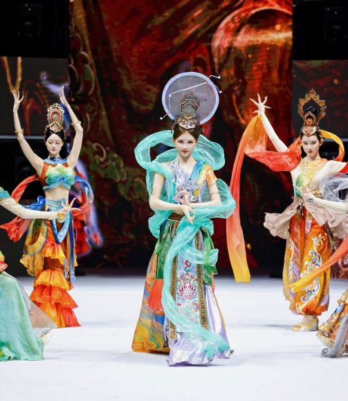 下半场以礼服华服为主题,以复原重生的方式向文化溯源:“星煌纪·天枢”系列礼服灵感源自洛阳龙门石窟壁画中的飞天意象,通过飘逸偏光皱纱与LED灯带,打破古典与未来的次元壁,实现传统美学与未来科技的视觉对话;“汴京百象”系列礼服设计以宋代市井画卷为源,萃取卖货郎等百态人物的服饰精髓,融青绿淡彩之雅、褙子罗衫之韵,以现代语言重构“俗雅交融”的宋式美学。