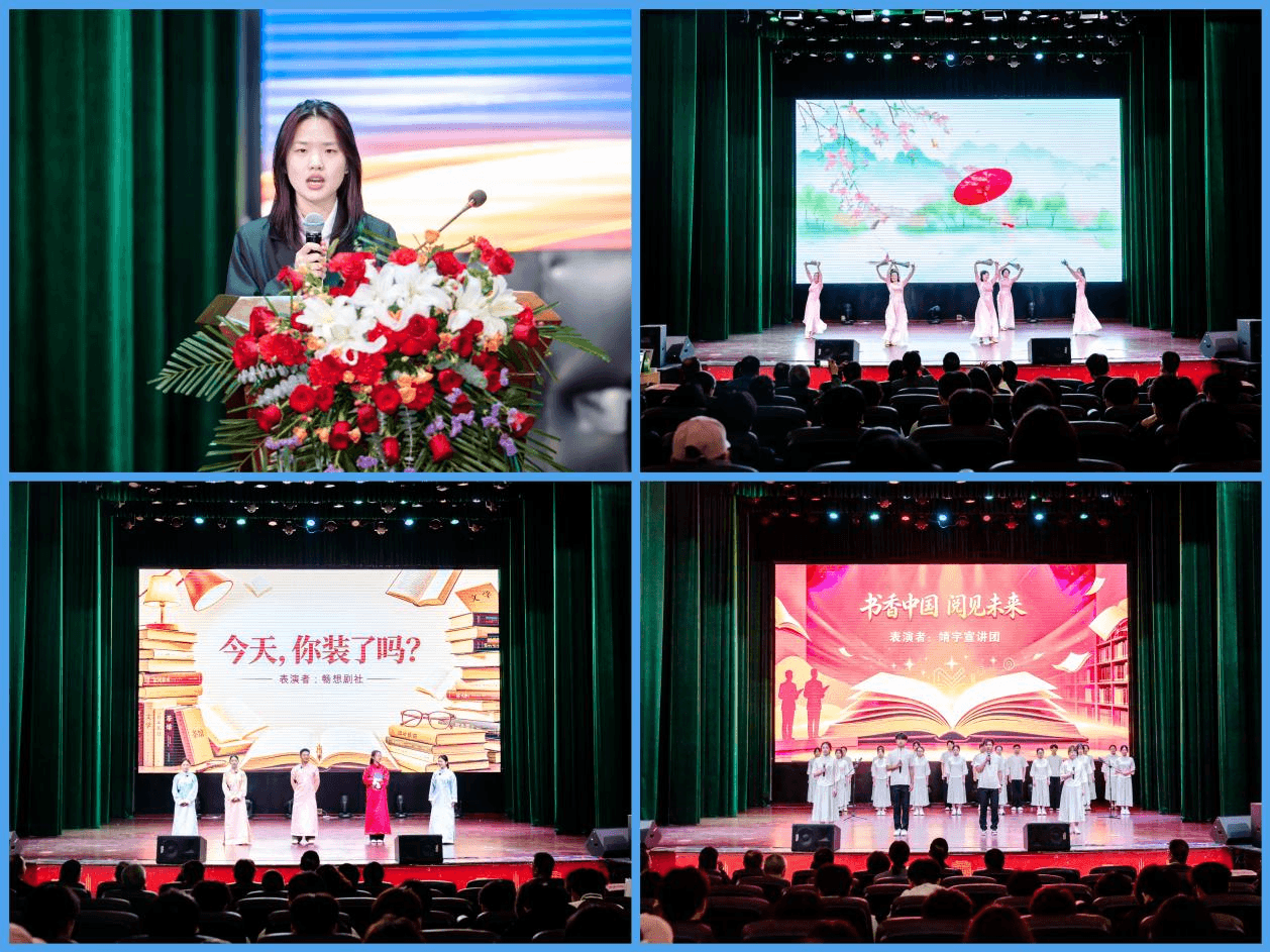 师生代表带来精彩的文艺表演。古典舞《一伞芳华》翩跹婉转,尽显东方雅韵;群口相声《今天,你装了吗》诙谐幽默,贴近校园生活;诗朗诵《书香中国 阅见未来》声情并茂,尽显青春朝气与对阅读的热爱。