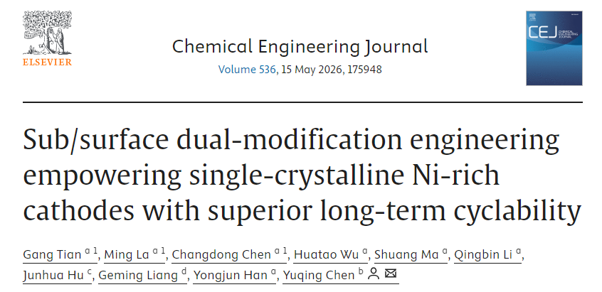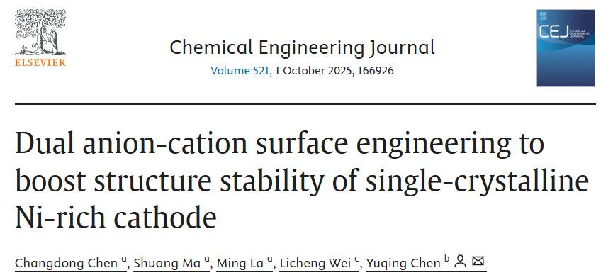 近日,平顶山学院材料科学与工程学院纳米能源材料研究团队联合澳大利亚阿德莱德大学同步辐射光源中心(QS世界排名82位)、佛山仙湖实验室协同攻关,在国际权威期刊《Chemical Engineering Journal》连续发表两篇研究论文,题目分别为《Dual anion-cation surface engineering to boost structure stability of single-crystalline Ni-rich cathode》与《Sub/surface dual-modification engineering empowering single-crystalline Ni-rich cathodes with superior long-term cyclability》。陈昌东博士、田刚博士分别为两篇论文第一作者,平顶山学院为论文第一完成单位。