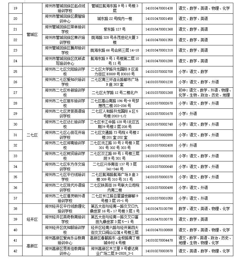 郑州市校外培训机构经过规范化治理,依据各区县(市)教育局统计上报情况,截止12月31日,现有111家(含高中阶段8家)证照齐全的校外培训机构经过教育部门审批、民政部门登记,具备学科类培训资质。其他未经教育部门审批的校外培训机构若从事学科类培训均属于违规违法行为。现向社会予以公布。
