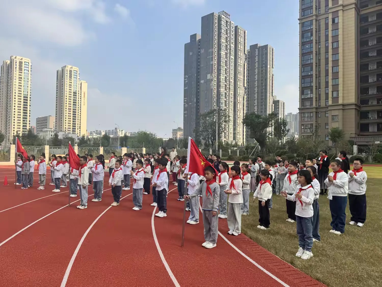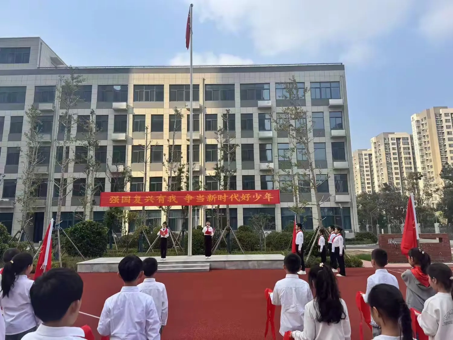 “准备着:为共产主义事业而奋斗!”“时刻准备着”全体队员在大队辅导员季老师的带领下齐声呼号,嘹亮的呼号声响彻校园。