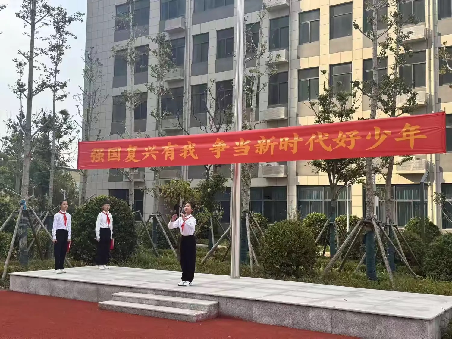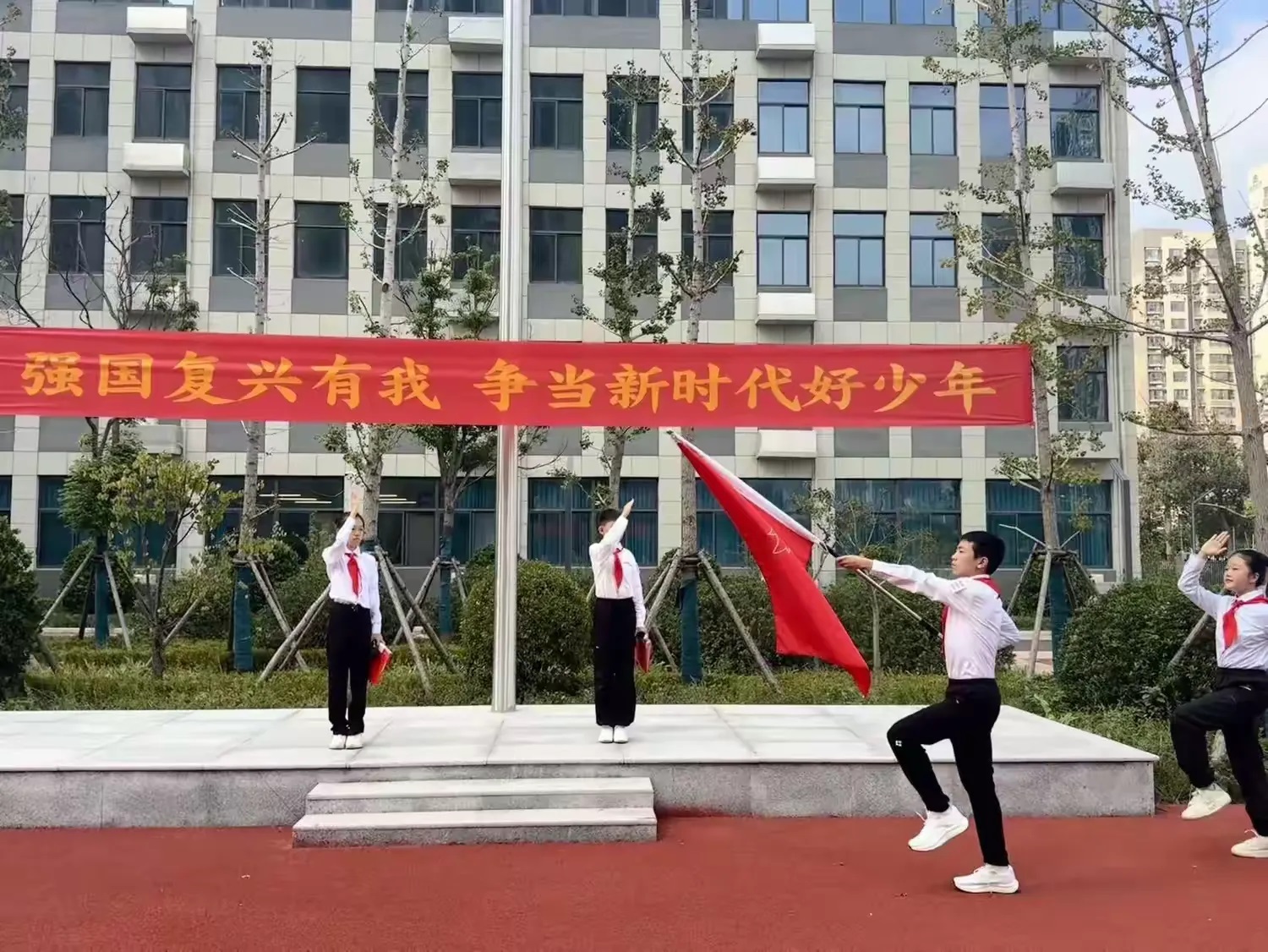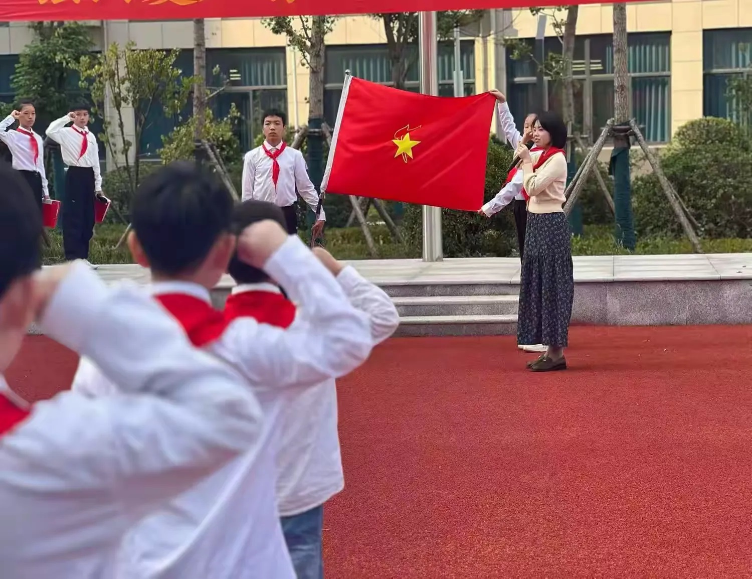 在激昂的旋律中,旗手们迈着整齐的步伐,精神饱满地走向会场。这一刻,队旗高高飘扬,承载着我们的理想。