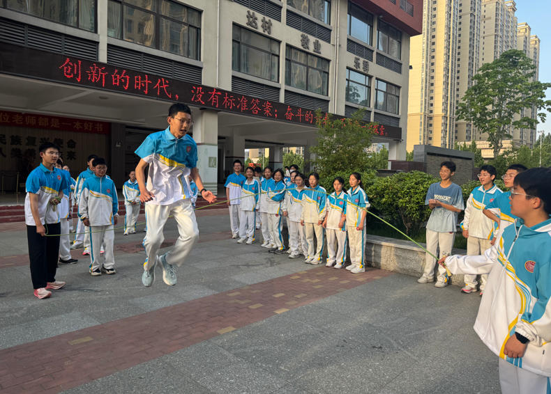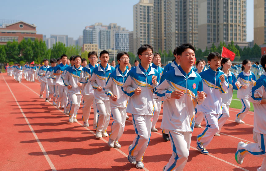 随着大课间铃声轻快响起,二七区实验中学的操场上迅速有序地涌入一队队的少年,静谧的校园瞬间被青春的活力填满,孩子们在操场内和跑道上以班级为单位畅快奔跑,另一部分孩子在校园内的角角落落或者跳绳、或者踢毽子、或者打羽毛球……