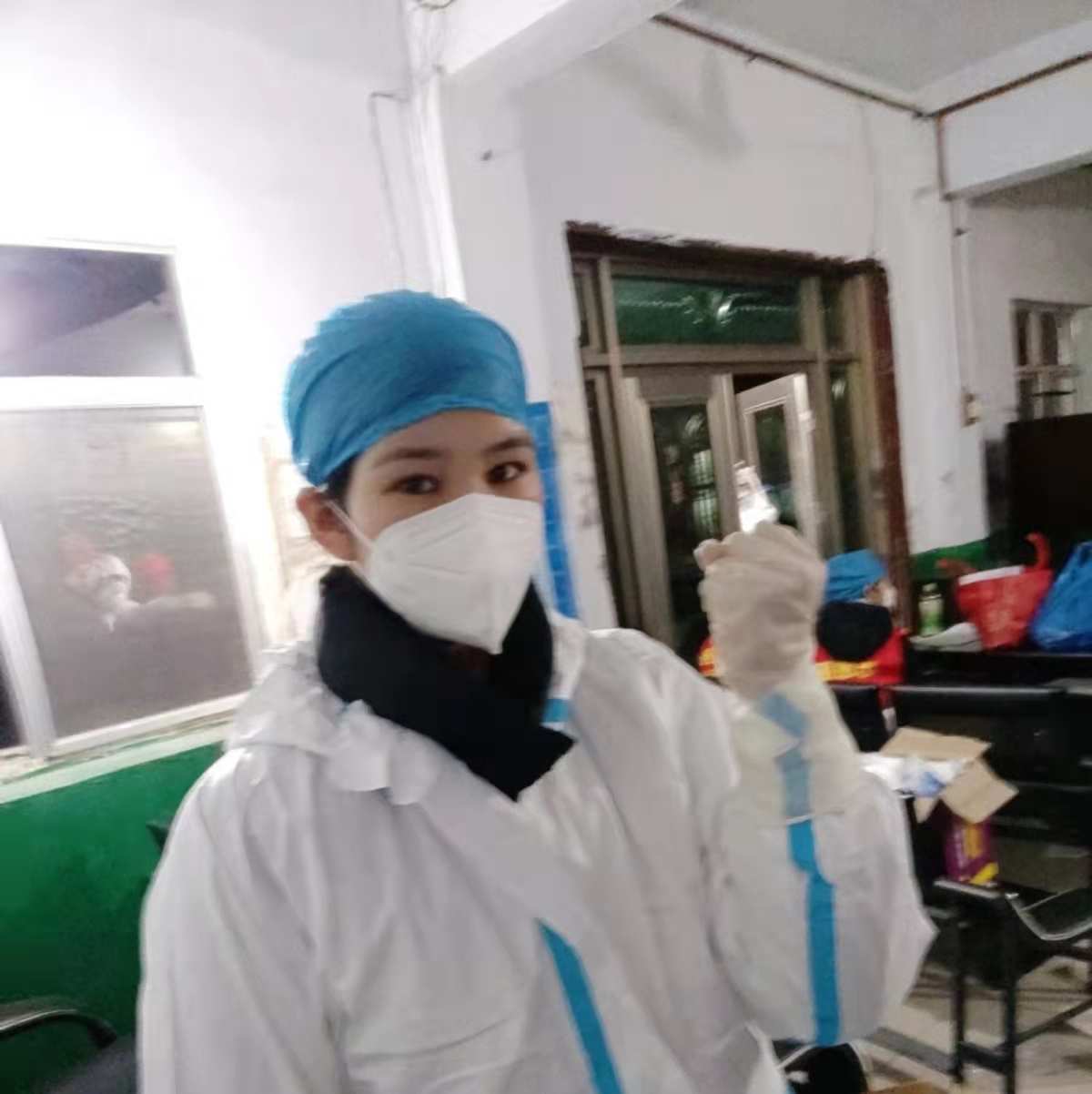 图:张丹菲身着防护服坚定抗疫必胜信心