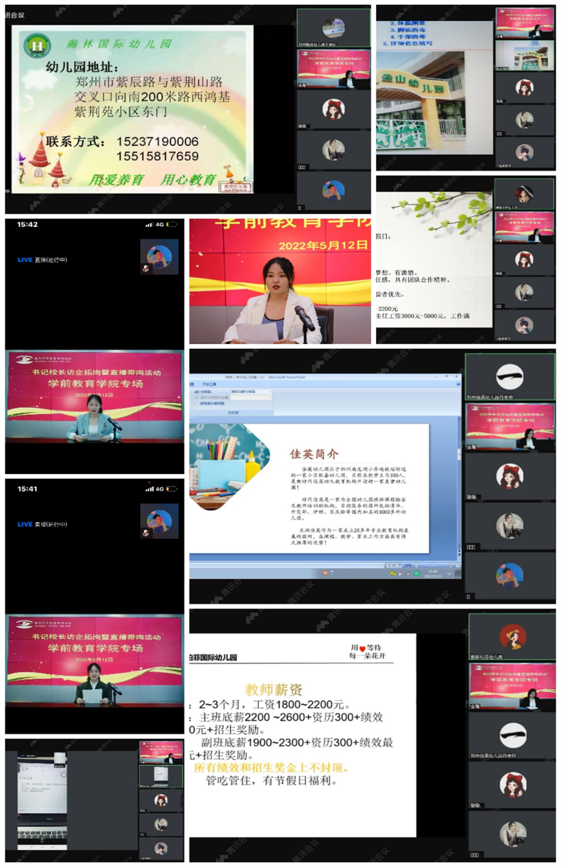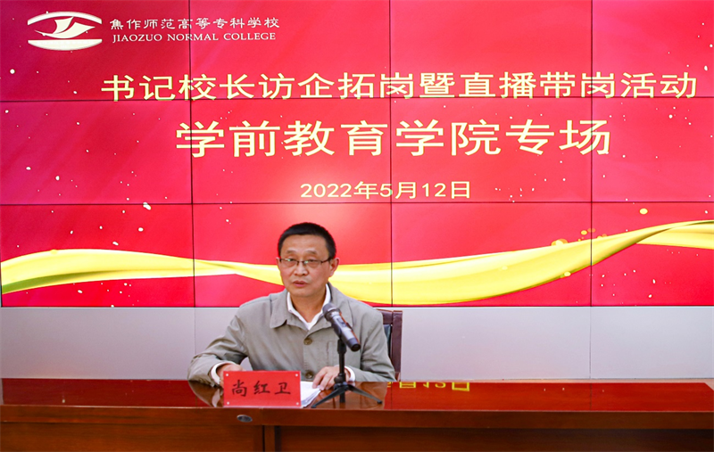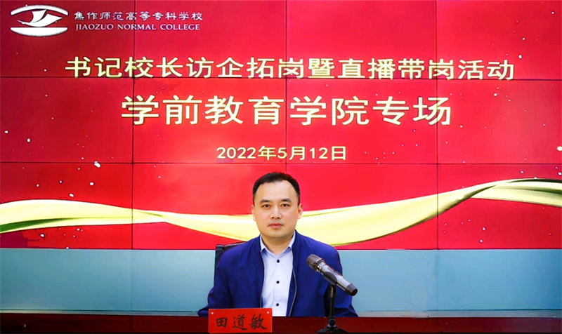 为认真落实教育部关于书记校长访企拓岗促就业专项行动的有关要求,千方百计开拓更多就业岗位和机会,5月12日下午,焦作师范高等专科学校举办了书记校长访企拓岗暨直播带岗活动(学前教育学院专场),校长田道敏、学前教育学院党总支书记尚红卫、6家企业代表以及3名优秀学生代表参与了直播连线。直播间主持人由学前教育学院辅导员史金鹭担任。