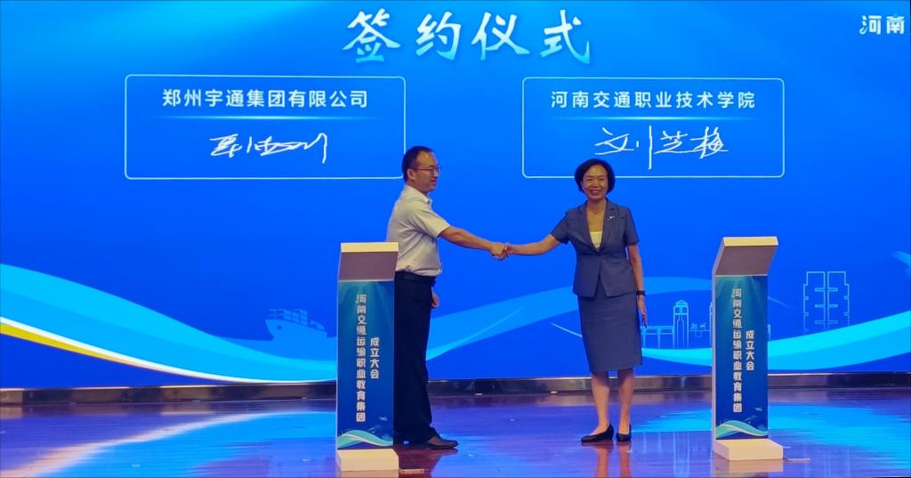 7月7日上午,河南交通运输职业教育集团成立大会上,河南交通职业技术学院副校长刘芝梅与宇通集团教育科技公司总经理韩德利,分别代表学校与宇通集团签署校企合作协议,双方共建宇通产业学院。