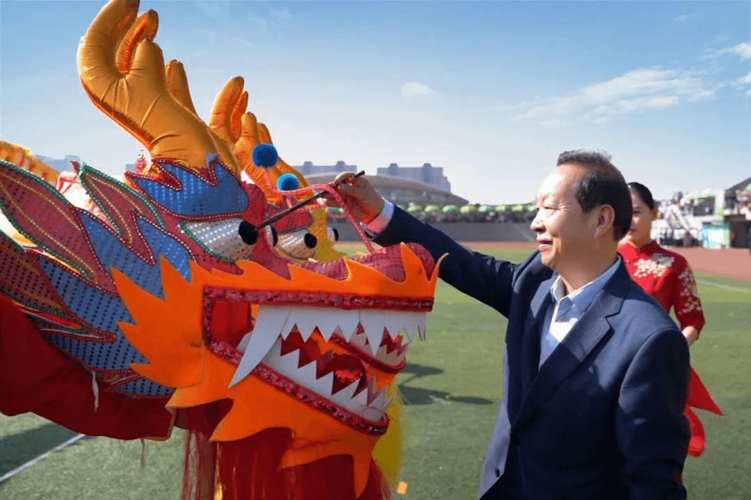 巨龙飞,战鼓擂。校长徐洪波为游龙点睛,开启了气势磅礴的舞龙表演。盘卷、穿插、翻腾、飞跃,体现一种民族精神、一种团结力量,中国风直接拉满。