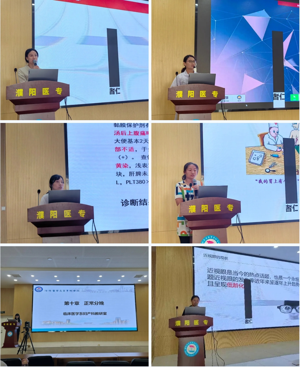 康复医学院刘晨蕾老师的《颈椎病患者的康复评定》内容贴合实际,将思政元素深化,与大局观相结合,利用导学病例引出学习重点,充分激发学习兴趣;讲解深入浅出,图文并茂,便于学生理解,培养临床思维。基础医学部张朋艳老师的《血型与输血》顺应逻辑,采用层层递进的方式推进教学,激发了学生的求知欲和学习兴趣。同时在授课过程中运用了图文资料,视频,临床案例等多种教学资源,增加了课程的趣味性和丰富性,把思政元素和专业知识巧妙地融入到一起,对于落实立德树人,确保高职高专院校人才培养目标的实现具有现实推广意义。基础医学部李晓坤老师的《消失的它—脂肪代谢分解》巧妙融入思政元素以常见的减肥话题引入市场上减肥药为例,引导学生树立科学的健康理念;通过介绍医学领域利用脂肪分解原理治疗疾病,培养学生的社会责任感和职业使命感,生动有趣,既传授专业知识,又实现了价值引领。临床医学院吉媛媛老师的《帽式包扎》通过编写口诀帮助记忆各个操作环节,同时采用边讲解边演示的方法进行展示,让学生更直观学习,通过讲述于逸飞等医生的事迹,强调医生的职业素养,仁爱主义,以8.19号的中国医师节寄望学生能够成长为有“医之术,师之德”的优秀人才。