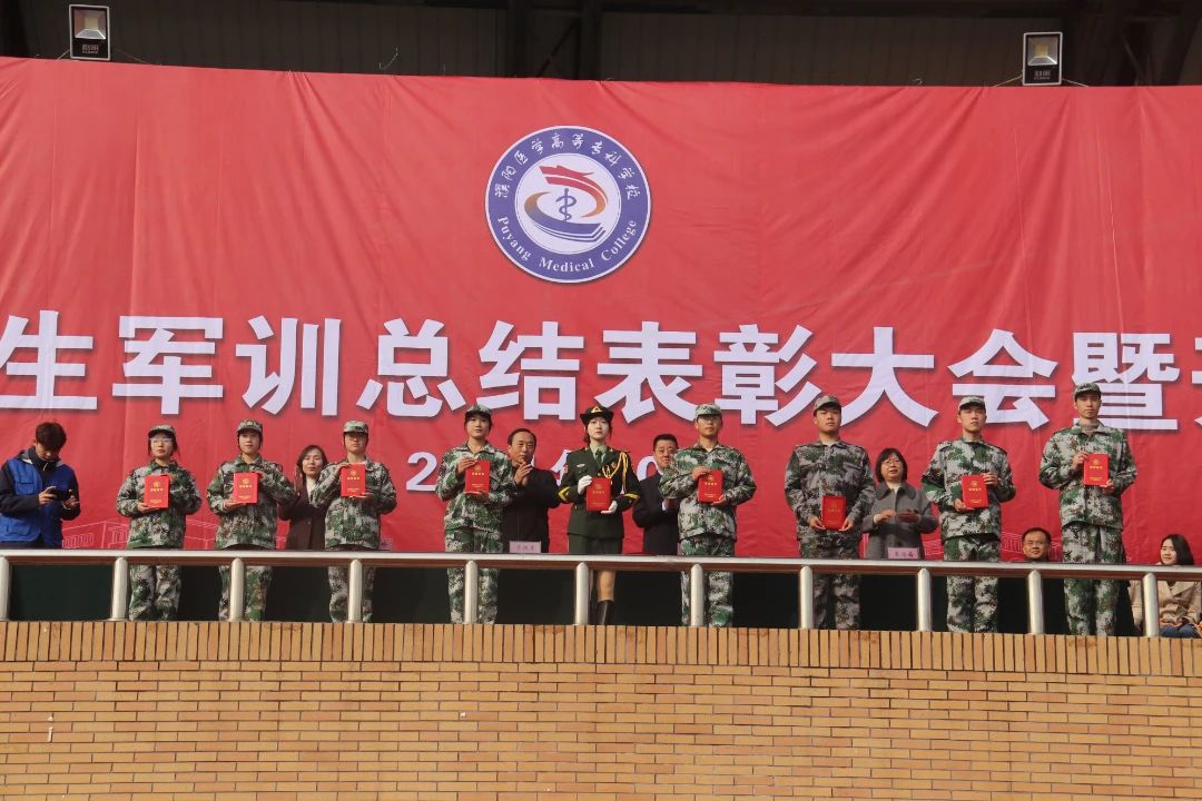 何美玲宣读了军训优秀个人表彰决定。护理学院、临床学院、药学院获得“军训优秀集体”;国旗班方阵王春晓等27名学生、军体拳方阵贺慧瑛等47名学生以及杨文杰等460名学院方阵学生被授予“军训标兵”称号。校领导分别为获奖集体和学生代表颁奖。