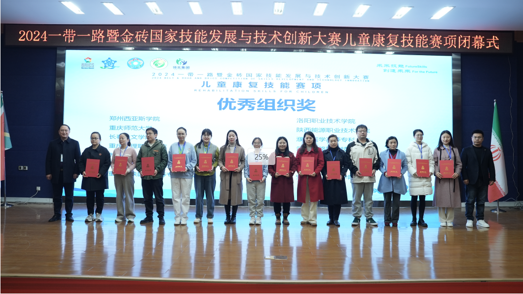 2024年11月29日至12月1日,2024一带一路暨金砖国家技能发展与技术创新大赛儿童康复技能赛项在重庆医药高等专科学校举办。濮阳医学高等专科学校选手在比赛中荣获佳绩,2023级康复治疗技术一班学生张灵鑫荣获言语赛道二等奖,2023级康复治疗技术一班李小宇荣获感统赛道优秀奖,2023级中医康复技术二班丁训获孤独症赛道优秀奖,边旭昭荣获优秀指导老师,濮阳医学高等专科学校荣获最佳组织奖。