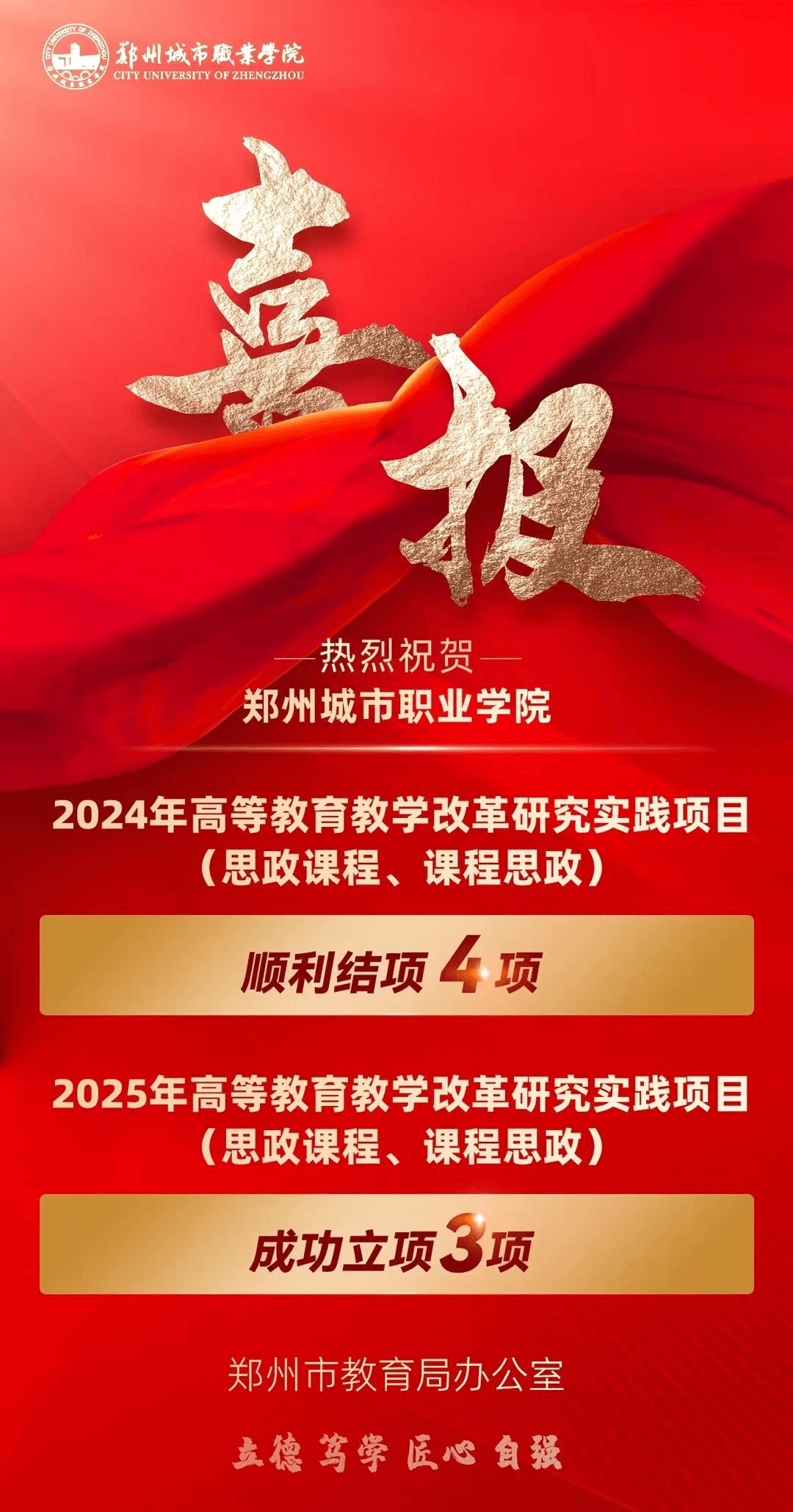 近日,郑州市教育局发布了《关于公布2024年高等教育教学改革研究实践项目(思政课程、课程思政)结项验收结果和2025年高等教育教学改革研究与实践项目(思政课程、课程思政)立项结果的通知》。郑州城市职业学院在2024年高等教育教学改革研究实践项目中顺利结项4项,2025年申报的3项新项目成功立项,通过验收和新获批项目的数量和质量均创历史新高。