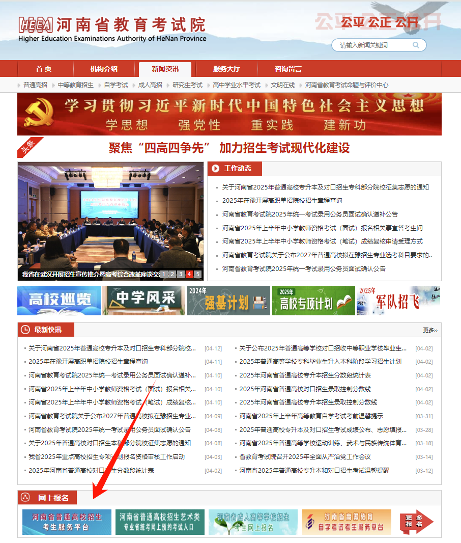 考生登录河南省教育考试院网站(https://www.haeea.cn),或在搜索引擎中输入“河南省教育考试院”,点击带有“官方”标识的网站。然后点击首页服务大厅中的“河南省普通高校招生考生服务平台"(https://pzwb.haeea.cn)。为了志愿填报稳定性,请同学们尽量用电脑进行操作,不要用手机。